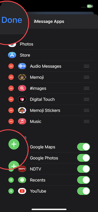 - Μόλις προσαρμόσετε το συρτάρι εφαρμογών στην εφαρμογή Apple Message στη συσκευή σας iOS ή iPados, φροντίστε να αξιοποιήσετεΓινώμενοςΣτην επάνω αριστερή γωνία της οθόνης για να τελειώσει.