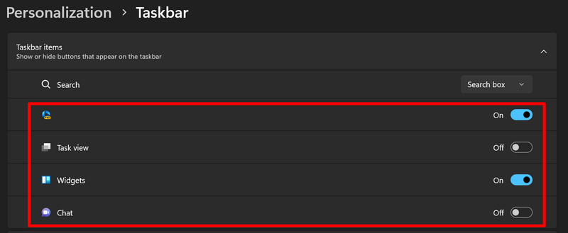 Σε αντίθεση με το κουμπί έναρξης της γραμμής εργασιών, τα άλλα στοιχεία μπορούν να προστεθούν ή να αφαιρεθούν από ή προς τη γραμμή εργασιών στο Windows 11 PC ή το φορητό υπολογιστή σας σύμφωνα με τις προτιμήσεις σας. Ακολουθήστε τα βήματα παρακάτω για να προσθέσετε ή να καταργήσετε τα εν λόγω στοιχεία της γραμμής εργασιών στα Windows 11: