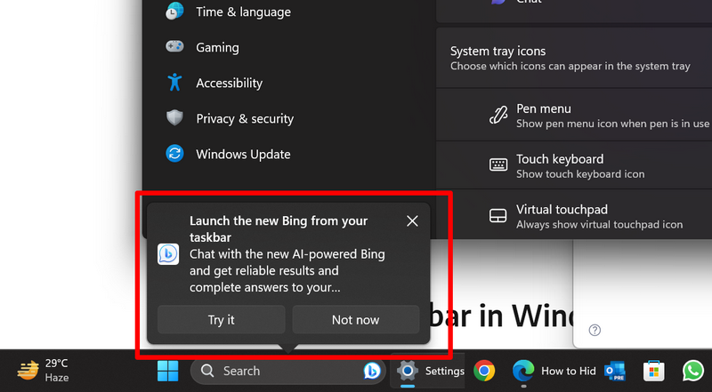 Το UI αναζήτησης στη γραμμή εργασιών που πήρε πρόσφατα την ενσωμάτωση Bing AI chat στα Windows 11 μπορεί επίσης να κρυφτεί ή να προσαρμοστεί σύμφωνα με την προτίμηση σας στον υπολογιστή ή τον φορητό υπολογιστή σας. Ακολουθήστε τα βήματα παρακάτω για να αποκρύψετε ή να προσαρμόσετε το κουμπί αναζήτησης στη γραμμή εργασιών της συσκευής σας Windows 11: