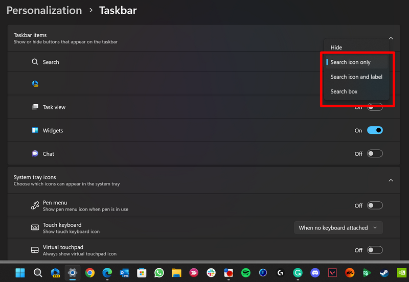 4.Εκτός από αυτό, μπορείτε να επιλέξετε τοΜόνο εικονίδιο αναζήτησης,Εικονίδιο και ετικέτα αναζήτησης,Πλαίσιο αναζήτησηςΕπιλογές στο μενού Overflow για να προσαρμόσετε το UI αναζήτησης στη γραμμή εργασιών του υπολογιστή σας ή του φορητού υπολογιστή Windows 11.