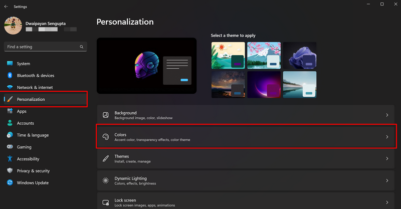 Εκτός από την ενεργοποίηση των αποτελεσμάτων της διαφάνειας για τη γραμμή εργασιών στον υπολογιστή ή το φορητό υπολογιστή σας, μπορείτε επίσης να το κάνετε το ίδιο χρώμα με το θέμα του θεματικού χρώματος της συσκευής σας. Για να προσαρμόσετε το χρώμα της γραμμής εργασιών στη συσκευή σας Windows 11, ακολουθήστε τα βήματα παρακάτω: