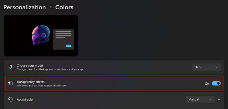 Με αυτό το ενεργοποιημένο στη συσκευή σας, η γραμμή εργασιών θα αντικατοπτρίζει τα χρώματα της εικόνας του φόντου σας και θα εκπέμπει ένα ημιδιαφανές αποτέλεσμα όταν χρησιμοποιείτε τον υπολογιστή σας Windows 11 ή το φορητό υπολογιστή σας.