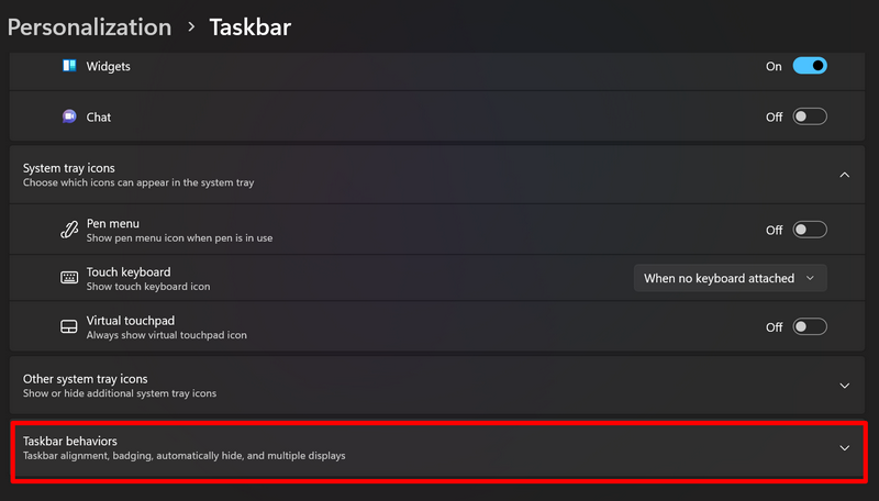 2.Στη σελίδα Ρυθμίσεις της γραμμής εργασιών, μετακινηθείτε προς τα κάτω στοΣυμπεριφορές γραμμής εργασιώνΕνότητα και κάντε κλικ για να επεκταθεί, αν δεν επεκταθεί ήδη.