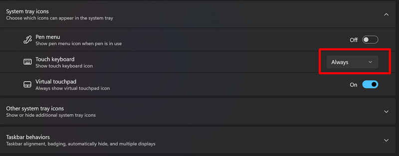 Εδώ, μπορείτε να προσθέσετε ή να αφαιρέσετε ορισμένα κουμπιά προσβασιμότητας, όπως το πληκτρολόγιο αφής και τα κουμπιά εικονικού touchpad για εύκολη πρόσβαση σε αυτά όταν χρειάζεται. Μπορείτε να ακολουθήσετε τα βήματα παρακάτω για να προσθέσετε τα προαναφερθέντα στοιχεία στην περιοχή δίσκου του συστήματος της γραμμής εργασιών στη συσκευή σας Windows 11: