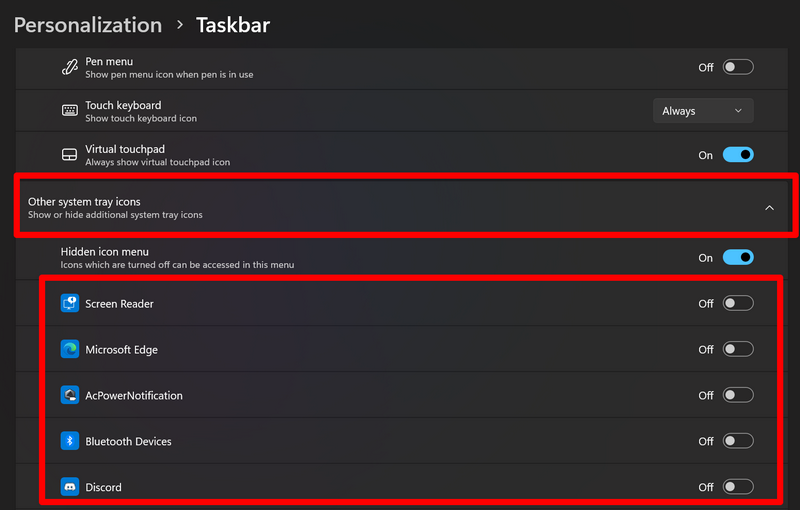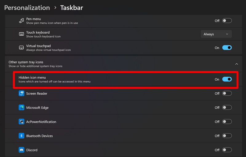 7.Μπορείτε επίσης να ενεργοποιήσετε ή να απενεργοποιήσετε την εναλλαγή για τοΜενού Κρυφού εικονιδίουΕπιλογή για να εμφανίσετε ή να αποκρύψετε το κουμπί μικρού βέλους στη γραμμή εργασιών που αποκαλύπτει τις εφαρμογές φόντου που εκτελούνται στο Windows 11 PC ή στο φορητό υπολογιστή σας.