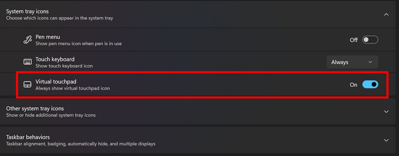 4.Στη συνέχεια, ενεργοποιήστε την εναλλαγή για τοΕικονικό touchpadΕπιλογή για να το προσθέσετε στην περιοχή του δίσκου του συστήματος της γραμμής εργασιών σας.
