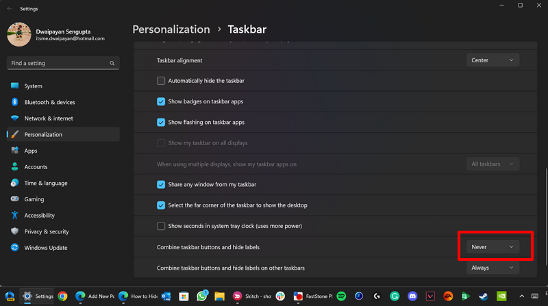 Τώρα, εάν προτιμάτε να δείτε τα ονόματα των ανοιχτών εφαρμογών αντί για τα επισημασμένα εικονίδια εφαρμογών στη γραμμή εργασιών του υπολογιστή σας Windows 11 ή του φορητού υπολογιστή σας, μπορείτε να εμφανίσετε τις ετικέτες εφαρμογών για τις εφαρμογές που ανοίγουν στη γραμμή εργασιών.