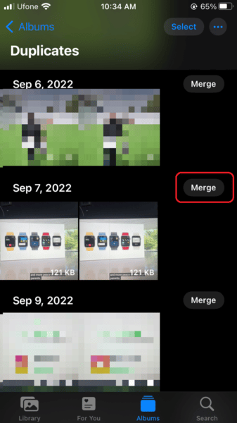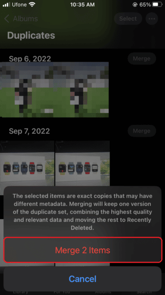 Η Apple λέει ότι "η συγχώνευση συνδυάζει σχετικά δεδομένα όπως λεζάντες, λέξεις -κλειδιά και αγαπημένα σε μια φωτογραφία με την υψηλότερη ποιότητα. Τα άλμπουμ που περιέχουν συγχωνευμένα αντίγραφα ενημερώνονται με τη συγχωνευμένη φωτογραφία". Έτσι, εάν αντιμετωπίζετε προβλήματα αποθήκευσης στο iPhone σας, μάθετε πώς να διαγράψετε γρήγορα τις διπλές φωτογραφίες παρακάτω.