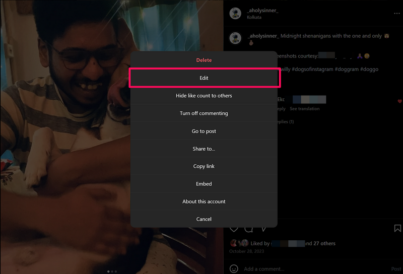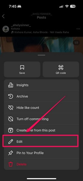 Εντοπίστε και ανοίξτε τη θέση Carousel που θέλετε να επεξεργαστείτε από το προφίλ σας Instagram, πατήστε το κουμπί τριών σημείων και, στη συνέχεια, επιλέξτε την επιλογή Επεξεργασία στο παρακάτω μενού.