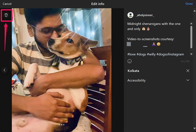 Το Instagram επιτρέπει στους χρήστες να διαγράφουν μεμονωμένες εικόνες/βίντεο μόνο από αναρτήσεις καρουσέλ που περιέχουν περισσότερες από δύο εικόνες ή βίντεο. Στο παρακάτω στιγμιότυπο οθόνης, μπορείτε να δείτε ότι καθώς η ανάρτηση Carousel έχει μόνο δύο εικόνες, δεν υπάρχει διαθέσιμο κουμπί διαγραφής για τις μεμονωμένες εικόνες.