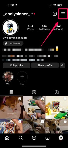 2. Μεταβείτε στο προφίλ σας InstagramκαιΠατήστε το κουμπί των τριών ράβδωνΣτο επάνω δεξιά.