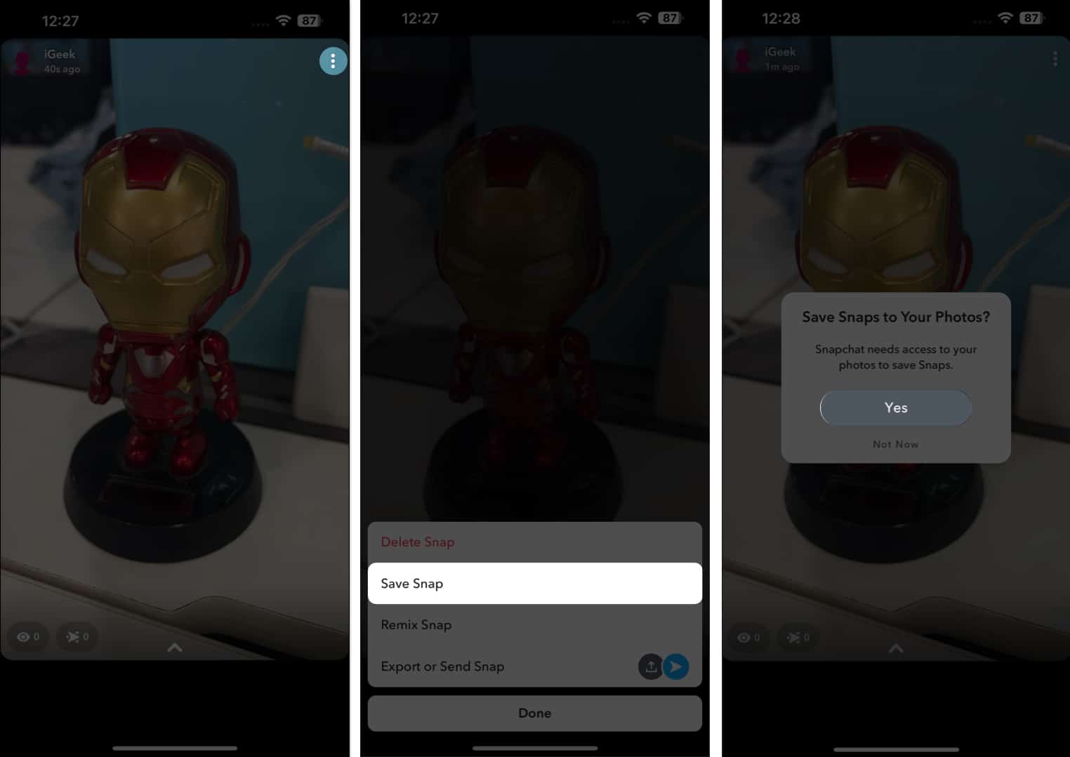 Σημείωμα: Για να είστε στην ασφαλή πλευρά, σώζοντας την ιστορία Snapchat πριν την αφαίρεση είναι σοφή. Απλά πατήστε τοεικονίδιο τριών σημείων→Αποθήκευση snap→ ΧτυπήστεΝαί. Με αυτόν τον τρόπο, η αντίστοιχη ιστορία θα εμφανιστεί στην εφαρμογή φωτογραφιών.
