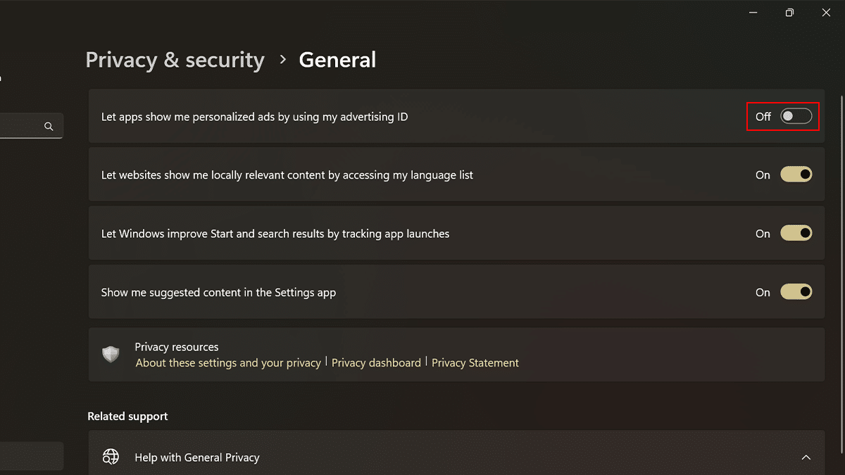 Σε ορισμένα σενάρια, οι εξατομικευμένες διαφημίσεις μπορούν να είναι χρήσιμες για να βρείτε τέτοια προϊόντα και υπηρεσίες που ενδέχεται να σας ενδιαφέρουν. Αλλά αν προτιμάτε να μην δείτε S με βάση τη συμπεριφορά σας, τα Windows 11 σας επιτρέπουν να απενεργοποιήσετε το αναγνωριστικό παρακολούθησης. Αν και μπορείτε να δείτε διαφημίσεις στις διάφορες εφαρμογές, δεν θα εξατομικευθούν.