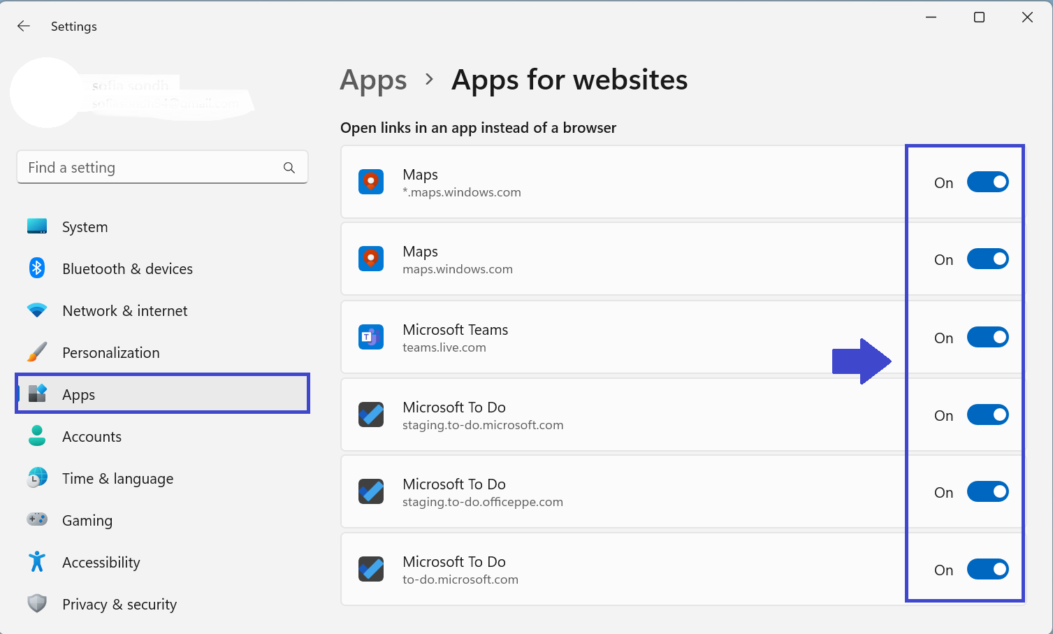 Στην παραπάνω εικόνα, υπάρχει η λίστα των εφαρμογών που μπορείτε να ενεργοποιήσετε ή να απενεργοποιήσετε να ανοίξετε συνδέσμους σε μια εφαρμογή αντί για ένα πρόγραμμα περιήγησης.