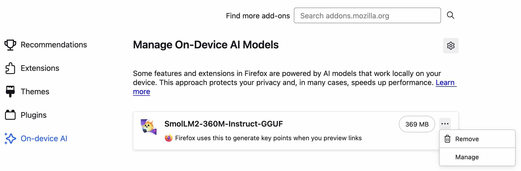 Μπορείτε επίσης να καταργήσετε τυχόν μοντέλα AI που ο Firefox έχει αποθηκεύσει τοπικά: