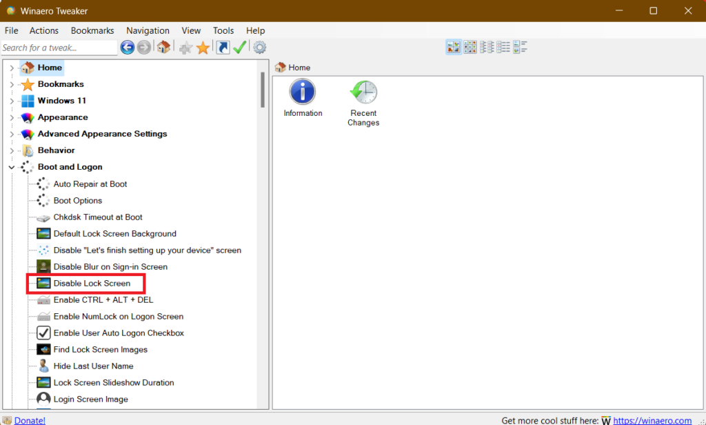 Επιπλέον, για το πλεονέκτημα του χρήστη, το Winaero Tweaker παρέχει μια άμεση επιλογή για να απενεργοποιήσετε την οθόνη κλειδώματος στα Windows 11, εξοικονομώντας σας από την απομάκρυνση σε κλειδιά μητρώου ή την πλοήγηση σε σύνθετες ρυθμίσεις πολιτικής. Δείτε πώς μπορείτε να απενεργοποιήσετε την οθόνη κλειδώματος χρησιμοποιώντας το Winaero Tweaker: