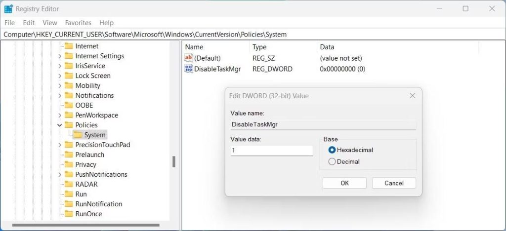 HKEY_CURRENT_USERSoftwareMicrosoftWindowsCurrentVersionPoliciesSystem