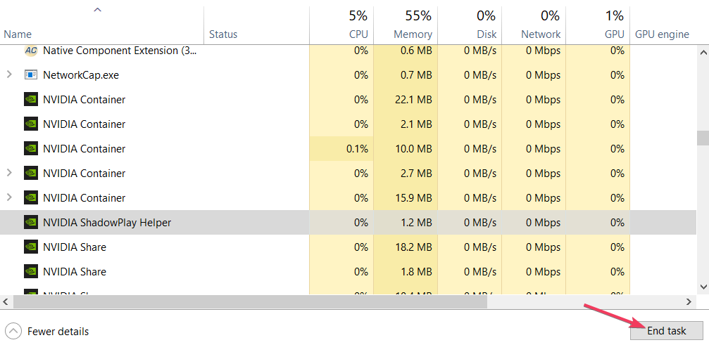 2. Αναζητήστε και επιλέξτε έναΒοηθός Nvidia Shadowplayδιαδικασία μέσα στοΔιαδικασίεςαυτί.