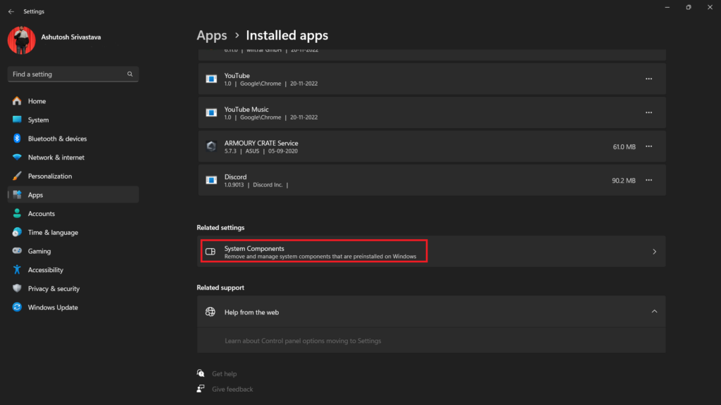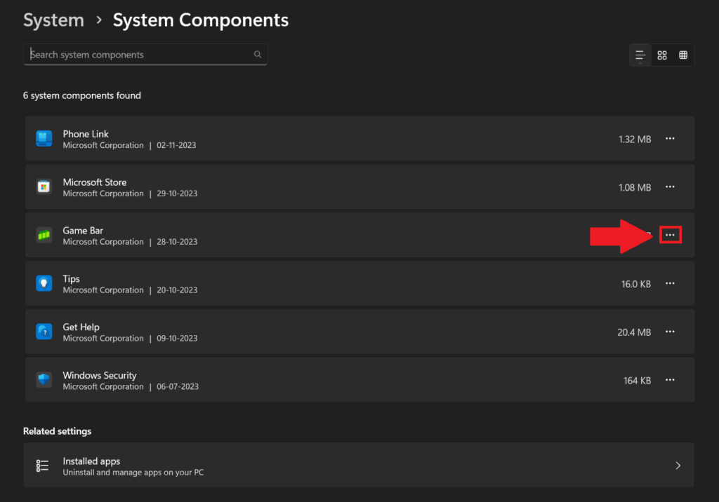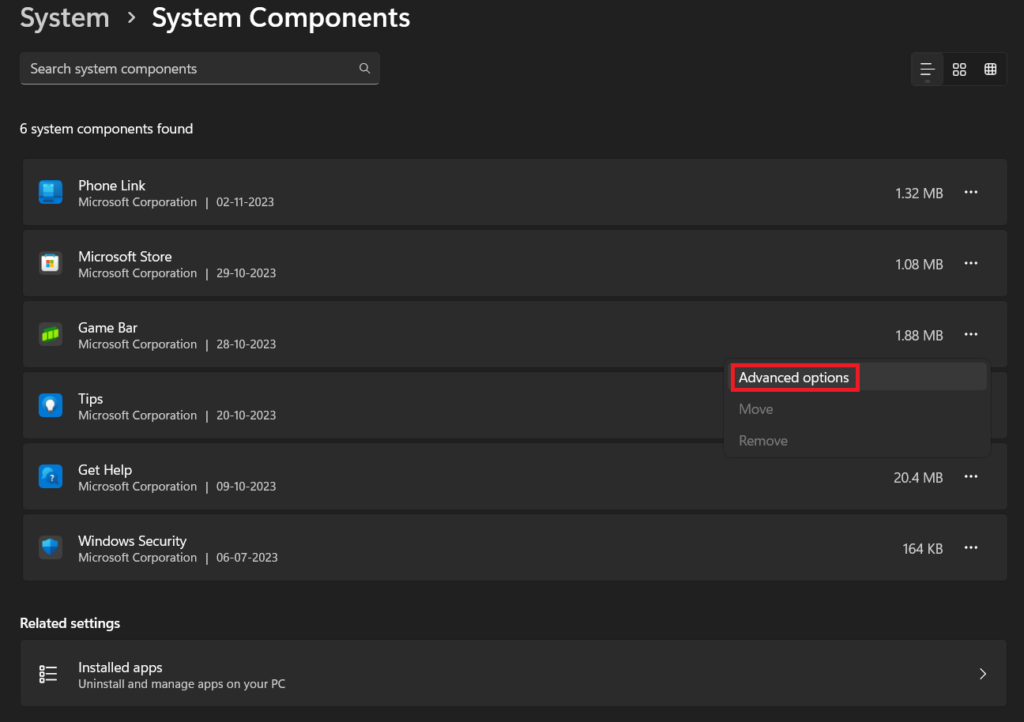 4.Μετακινηθείτε προς τα κάτω και κάντε κλικ στοΣυστατικά συστήματοςκάτω από τοΣχετικές ρυθμίσειςτμήμα.