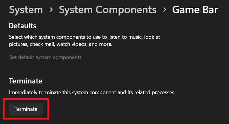 8.Μετακινηθείτε προς τα κάτω και κάντε κλικ στοΠερατώκουμπί για να σταματήσετε όλες τις ενεργές διαδικασίες της γραμμής παιχνιδιών Xbox.