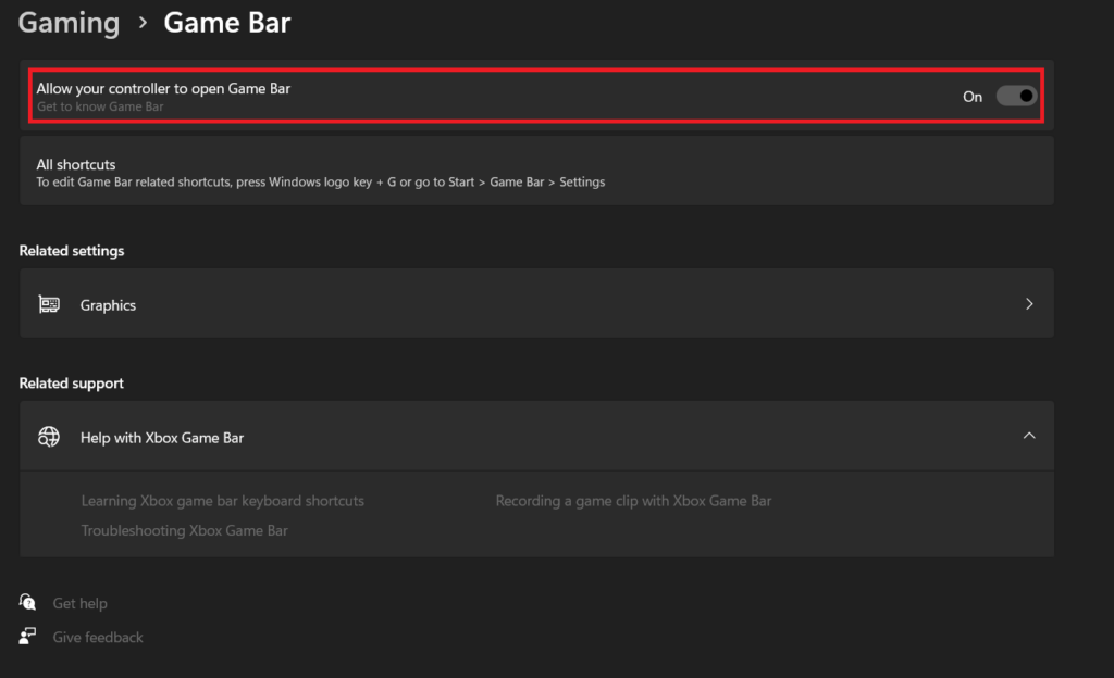 3.ΣτοΤυχερό παιχνίδιΕνότητα, επιλέξτε τοΜπαρ παιχνιδιούΕπιλογή για να ανοίξετε τις ρυθμίσεις της γραμμής παιχνιδιών Xbox.