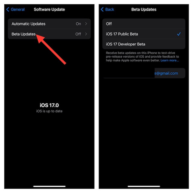 - Στη συνέχεια, πατήστεΕνημερώσεις betaκαι επιλέξτεiOS 17 δημόσιο beta.
