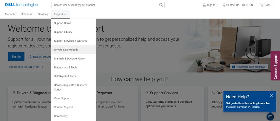Βήμα 2: Κάντε κλικ στο "Υποστήριξη" και επιλέξτε "Drivers & Downloads" από το μενού.