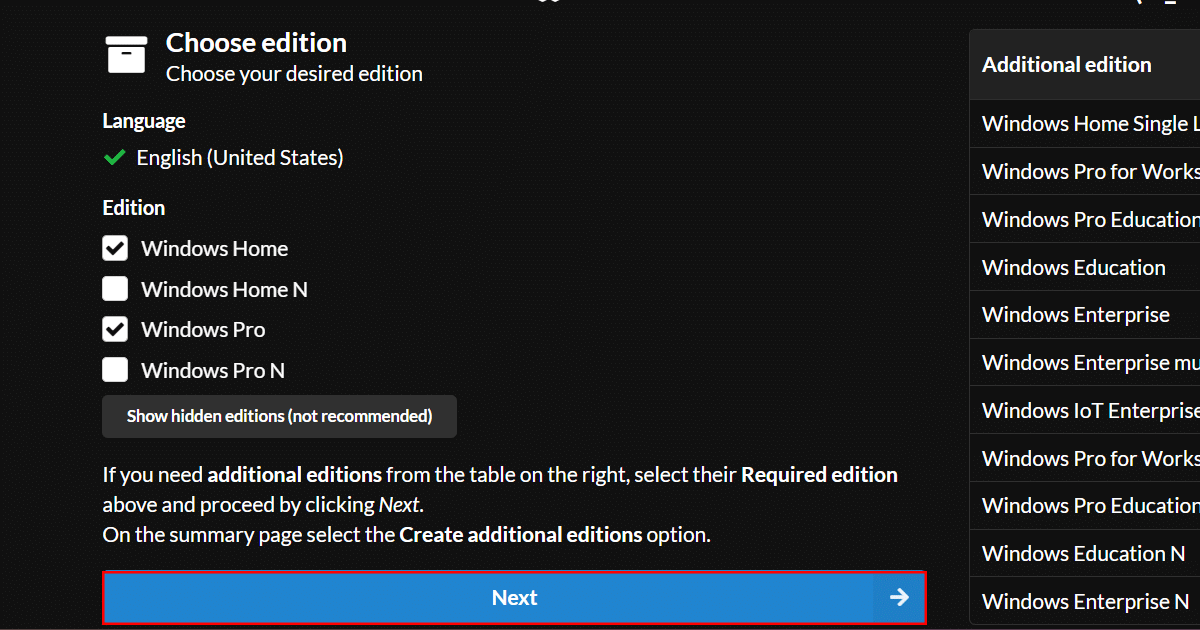 - Επιλέξτε τις εκδόσεις που θα συμπεριλάβετε στο αρχείο Windows 11 ISO 23H2 και κάντε κλικ στοΕπόμενοςκουμπί.