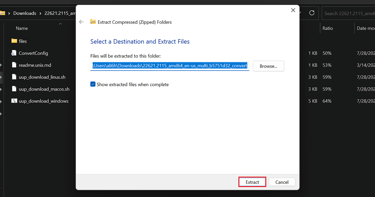 - Επιλέξτε τη θέση για να εξαγάγετε τα αρχεία και κάντε κλικ στοΕκχύλισμακουμπί.