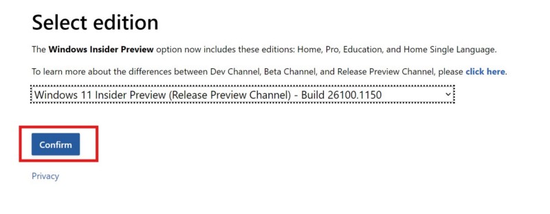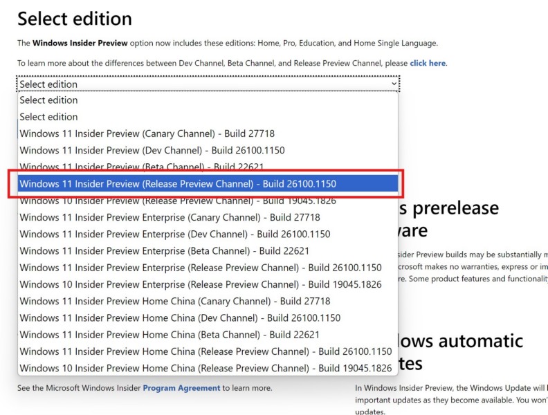 4.Τώρα, επιλέξτε τοΠροεπισκόπηση Windows 11 Insider (κανάλι προεπισκόπησης απελευθέρωσης) - Κατασκευή 26100.1150επιλογή.