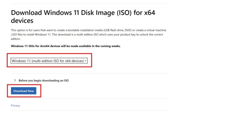 3.Στο αναπτυσσόμενο μενού, επιλέξτε τοWindows 11 (συσκευή πολλαπλών εκδόσεων για X64)επιλογή και πατήστε τοΚουμπί λήψης τώραπαρακάτω.