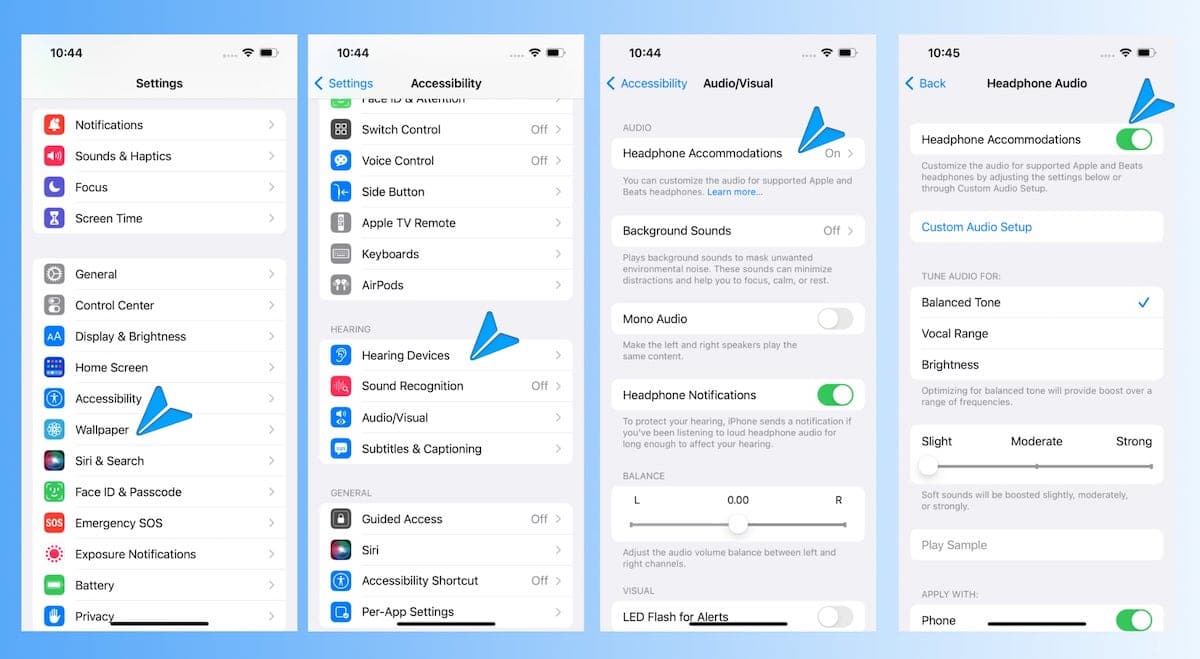 - Πατήστε στο Audio/Visual> Διαμονή ακουστικών> Ενεργοποιήστε τη ρύθμιση "καταλύματος ακουστικών" για να προσαρμόσετε τον ήχο των AirPods.