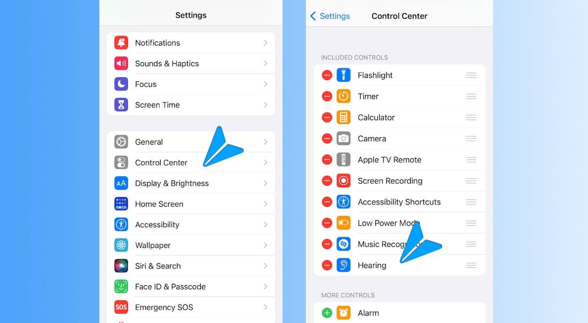 - Μεγάλη πατήστε και σύρετε την εναλλαγή "Ακρόαση" στο μενού "Περιλαμβάνονται τα στοιχεία ελέγχου" για εύκολα και γρήγορα πρόσβαση στο χαρακτηριστικό στο κέντρο ελέγχου.