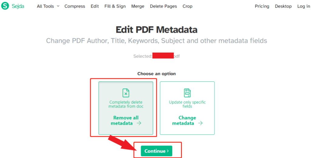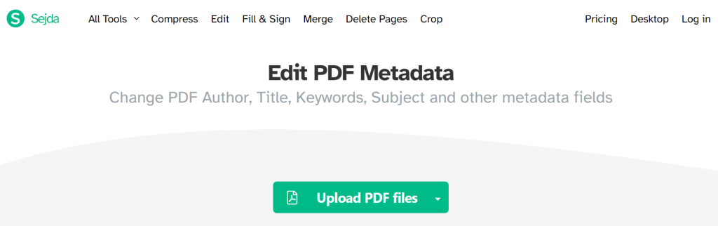 Εάν ψάχνετε για μια μέθοδο για την εξάλειψη των μεταδεδομένων PDF χωρίς να βασίζονται σε πληρωμένες εφαρμογές, η SEJDA αναδύεται ως μια αξιοσημείωτη λύση. Λειτουργεί εξ ολοκλήρου εντός του προγράμματος περιήγησης ιστού σας, εξυπηρετώντας τόσο ως επεξεργαστή PDF όσο και ως αφαίρεσης μεταδεδομένων. Με το SEJDA, έχετε τη δύναμη να αντικαταστήσετε τα μεταδεδομένα ή να επιλέξετε την ολοκληρωμένη απομάκρυνση όλων των μεταδεδομένων από τα PDF σας.