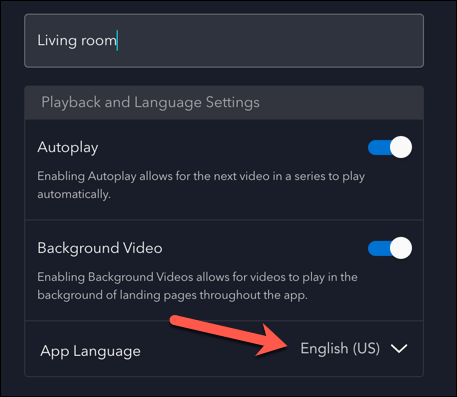 - Για να ελέγξετε τις ρυθμίσεις αναπαραγωγής, επιλέξτε και πραγματοποιήστε αλλαγές στις επιλογές στοΑναπαραγωγή και γλώσσαΤμήμα ρυθμίσεων. Για παράδειγμα, εάν θέλετε να αλλάξετε σε διαφορετική γλώσσα για αυτό το προφίλ χρήστη, επιλέξτε αυτό από τοΓλώσσα εφαρμογήςαναπτυσσόμενο μενού.