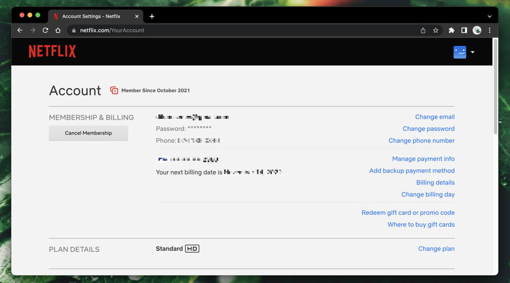 Πρέπει να ακυρώσετε τη συμμετοχή σας στο Netflix για να διαγράψετε το κύριο προφίλ σας Netflix. Για να το κάνετε αυτό, ανοίξτε το Netflix σε ένα πρόγραμμα περιήγησης ιστού και επιλέξτε το εικονίδιο του προφίλ σας. Στη συνέχεια, επιλέξτεΛογαριασμός>Ακύρωση μέλους.