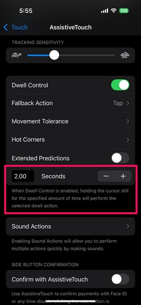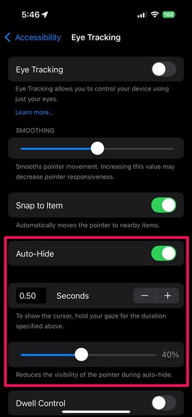 Με την ενεργοποίηση της δυνατότητας παρακολούθησης ματιών στη συσκευή σας, αξίζει να σημειωθεί ότι η επιλογή ελέγχου παραμονής θα είναι αυτόματα ενεργοποιημένη. Αυτή η επιλογή ουσιαστικά σας επιτρέπει να εκτελέσετε μια προεπιλεγμένη ενέργεια διατηρώντας το βλέμμα σας ακόμα για μια συγκεκριμένη διάρκεια κατά την πλοήγηση με την παρακολούθηση των ματιών στο iPhone σας.