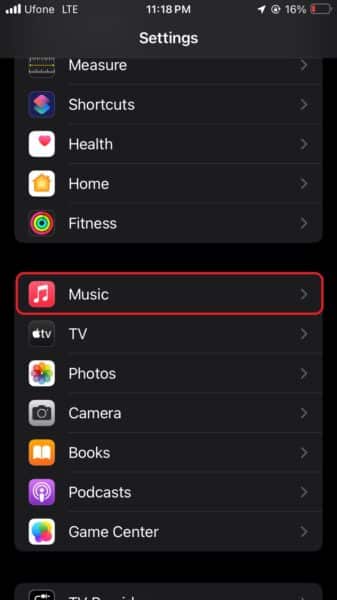 - Μετακινηθείτε προς τα κάτω το μενού Ρυθμίσεις μέχρι να βρείτεΜουσικήκαι πατήστε σε αυτό.