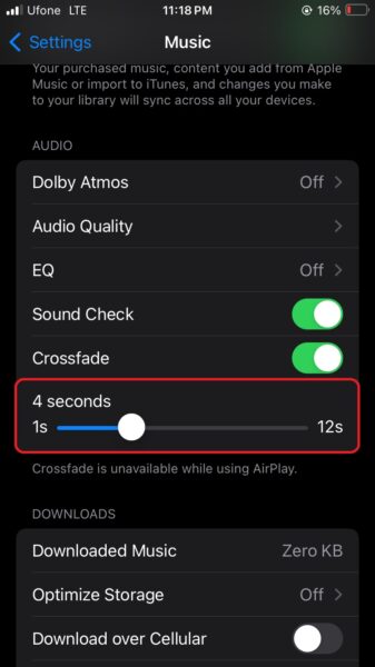 - ΟτανΔιασταύρωσηείναι ενεργοποιημένη, ένα ρυθμιστικό θα εμφανιστεί ακριβώς κάτω από το διακόπτη εναλλαγής. Αυτό το ρυθμιστικό σας επιτρέπει να επιλέξετε το μήκος του Crossfade, το οποίο μπορεί να κυμαίνεται από 1 έως 12 δευτερόλεπτα. Σύρετε τη ράβδο στην προτιμώμενη διάρκεια σας.