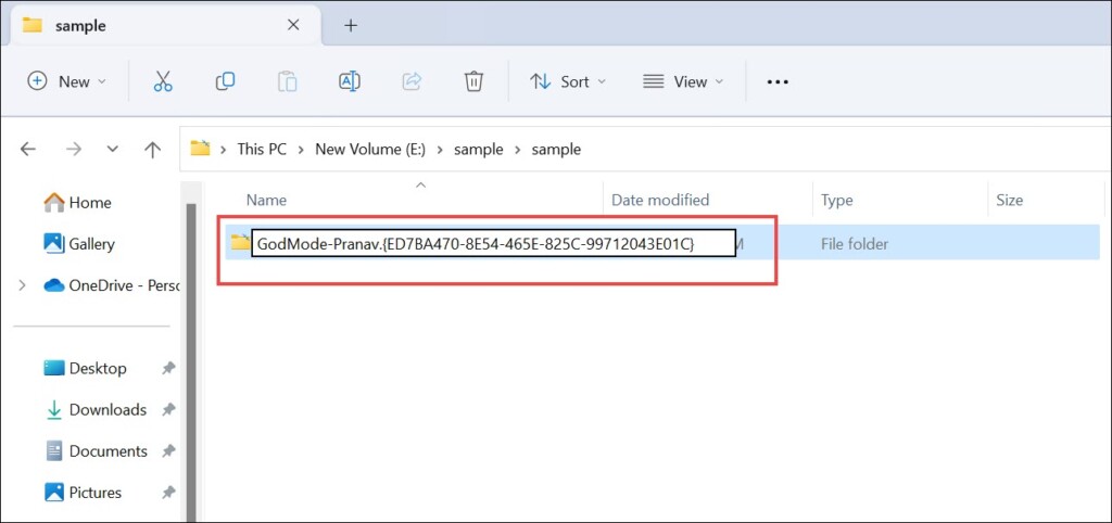 2.Αφού δημιουργήσετε το νέο φάκελο, κάντε δεξί κλικ σε αυτό και επιλέξτεΜετονομάζω. Διαγράψτε το υπάρχον όνομα φακέλου και αντικαταστήστε το με το ακόλουθο κείμενο (συμπεριλαμβανομένης της περιόδου):GodMode.{ED7BA470-8E54-465E-825C-99712043E01C}. Μπορείτε να τροποποιήσετε το τμήμα "Godmode" σε οτιδήποτε προτιμάτε (για παράδειγμα, χρησιμοποιώGodmode-Pranav), αλλά η περίοδος και η σειρά των χαρακτήρων που ακολουθούν πρέπει να παραμείνουν αμετάβλητες.
