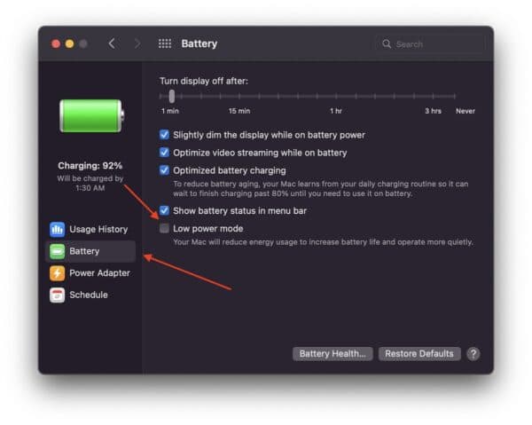 Η επίσημη περιγραφή της Apple σχετικά με τη δυνατότητα εξοικονόμησης μπαταρίας χαμηλής ισχύος είναι ότι η δυνατότητα να επιτρέπει τη δυνατότητα να μειώνει τη χρήση ενέργειας για να αυξήσει τη διάρκεια ζωής της μπαταρίας και να κάνει το MacBook να λειτουργεί πιο ήσυχα. Ενώ είναι δύσκολο να ακούσουμε τους οπαδούς στα νέα μοντέλα M1 Pro και M1 Max MacBook Pro, αυτή η λειτουργία μπορεί να μειώσει τον θόρυβο του ανεμιστήρα κάτω από βαρύ φόρτο εργασίας.