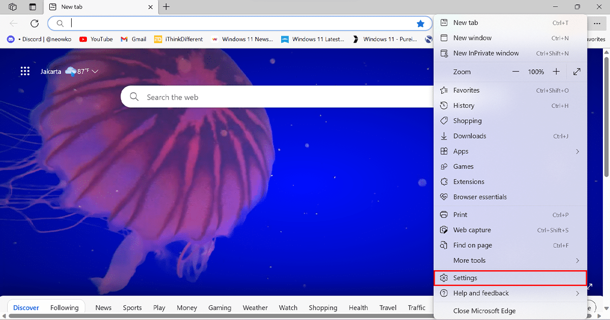 - Κάντε κλικ στοΡυθμίσεις και πολλά άλλα(τριπλό) κουμπί στην επάνω δεξιά γωνία και κάντε κλικ στο κουμπίΡυθμίσεις.