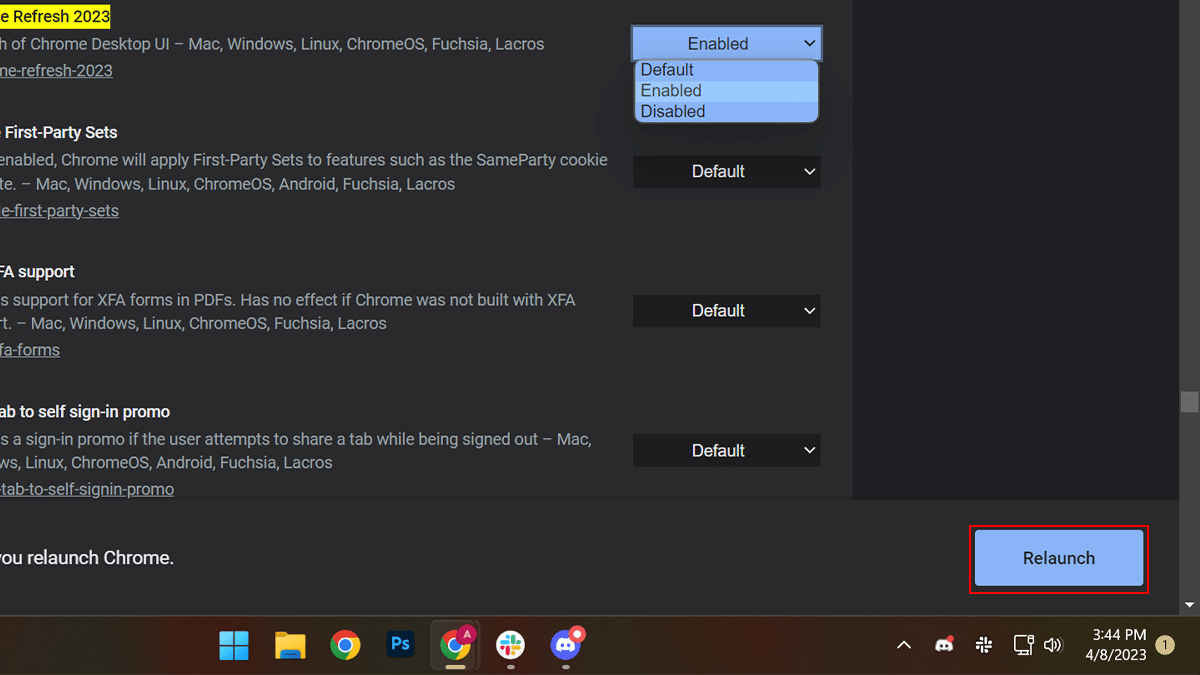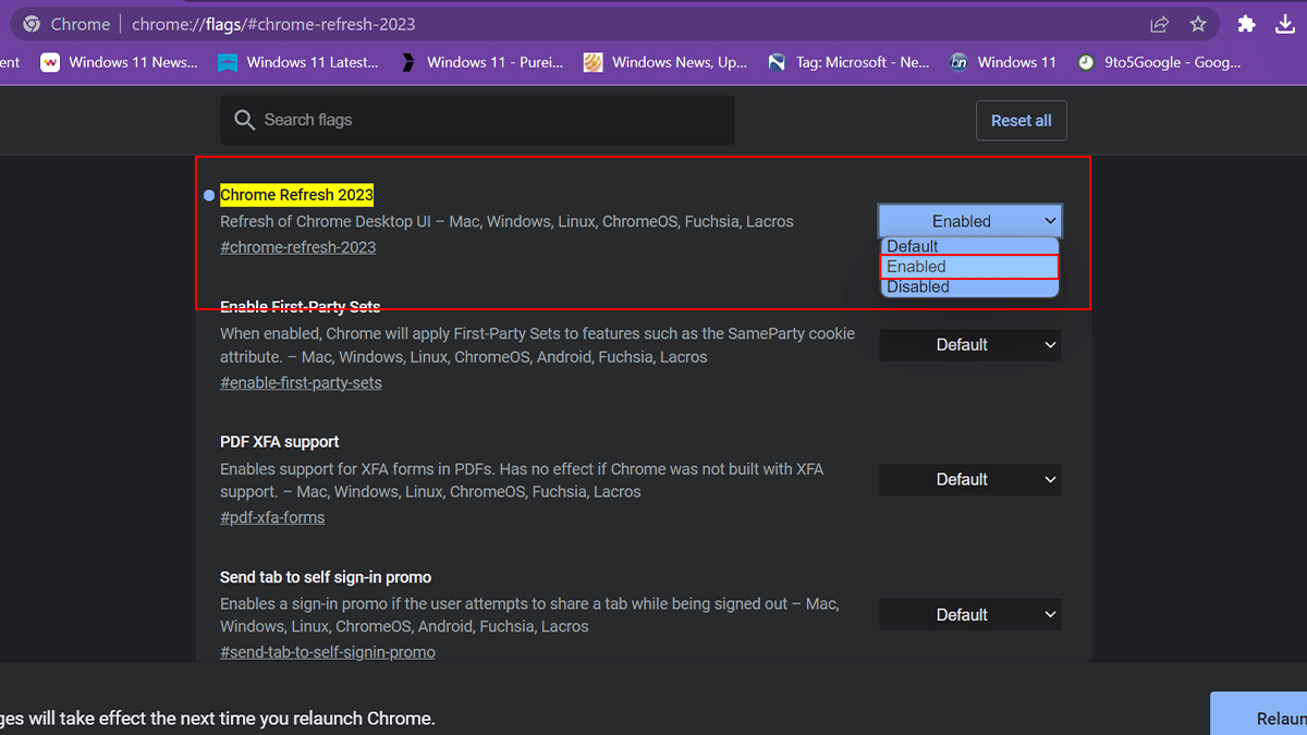 - Χρησιμοποιήστε τη ρύθμιση "Chrome Refresh 2023" στα δεξιά και επιλέξτε τοΕνεργοποιημένοςεπιλογή.