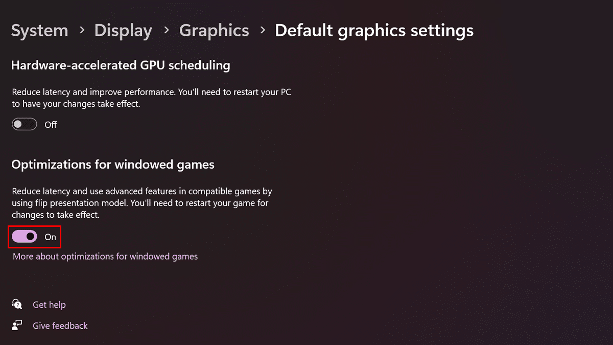 Το "Βελτιστοποιήσεις για τα Παιχνίδια Windowed" είναι ένα χαρακτηριστικό στα Windows 11 που μπορεί να βελτιώσει την απόδοση των παιχνιδιών παραθύρων. Αυτή η λειτουργία χρησιμοποιεί ένα νέο μοντέλο παρουσίασης για παιχνίδια DirectX 10 και DirectX 11 που εμφανίζονται σε ένα παράθυρο ή ένα παράθυρο χωρίς σύνορα. Αυτό έχει ως αποτέλεσμα χαμηλότερη λανθάνουσα κατάσταση και σας επιτρέπει να χρησιμοποιείτε άλλα νεότερα χαρακτηριστικά παιχνιδιών. Για παράδειγμα, αυτόματο HDR και μεταβλητό ρυθμό ανανέωσης (για οθόνες που το υποστηρίζουν).