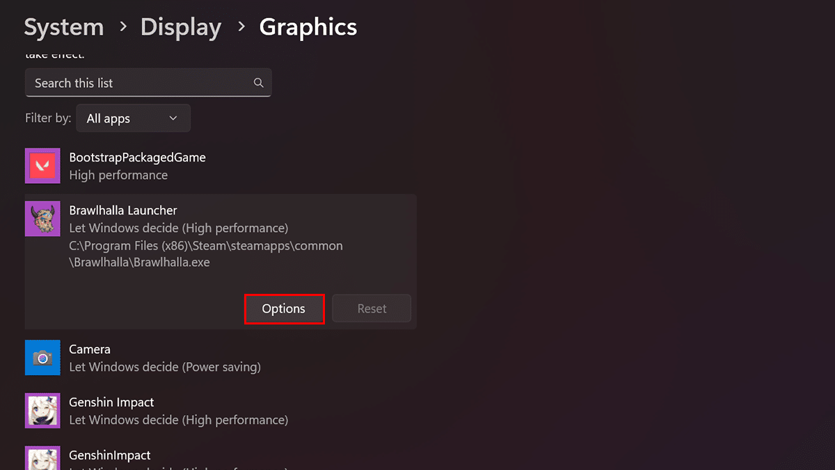 - Επιλέξτε την εφαρμογή και κάντε κλικ στοΕπιλογέςκουμπί.