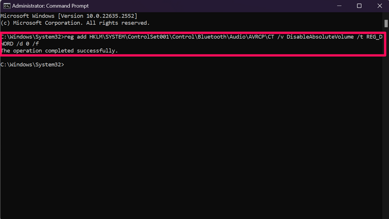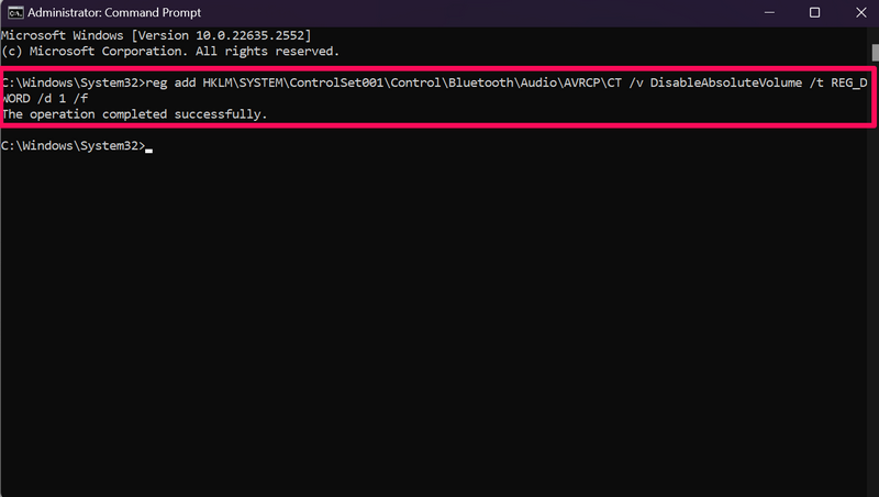 reg add HKLMSYSTEMControlSet001ControlBluetoothAudioAVRCPCT /v DisableAbsoluteVolume /t REG_DWORD /d 1 /f