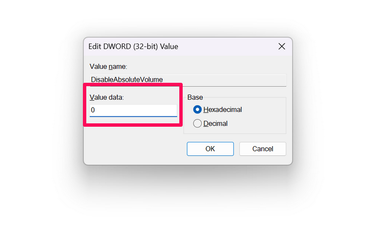 Σε περίπτωση που το επιθυμείτεΕνεργοποιήστε τον απόλυτο όγκο στον υπολογιστή ή τον φορητό υπολογιστή σαςΑργότερα, μπορείτε απλά να ακολουθήσετε τα παραπάνω βήματα,Αλλάξτε τα δεδομένα τιμήςτουΡώμακλειδίαπό 1 έως 0,Επανεκκινήστε τον υπολογιστή σας.