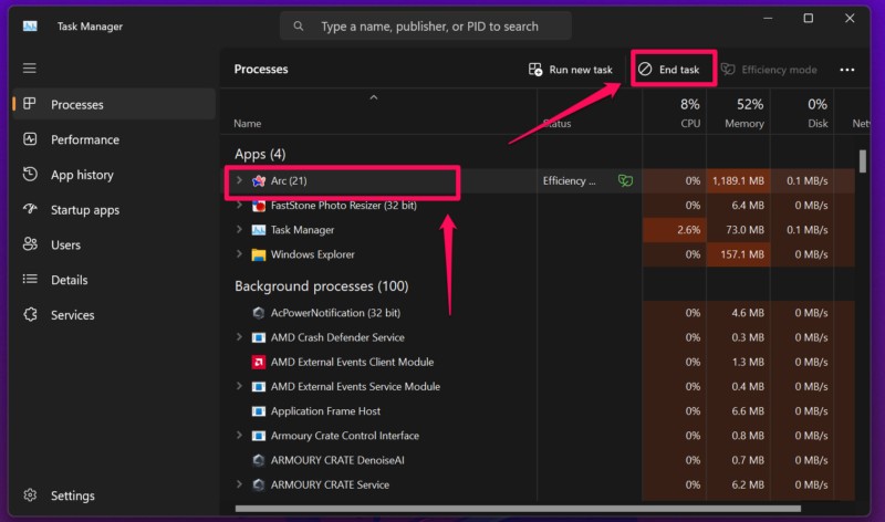 5.Μέσα στο παράθυρο του Manager Manager,Εντοπίστε την εφαρμογή ή το παιχνίδι που δεν ανταποκρίνεταιπου βρίσκεται σε πλήρη οθόνη κάτω από τοΤμήμα διαδικασιώνστο δεξιό παράθυρο.