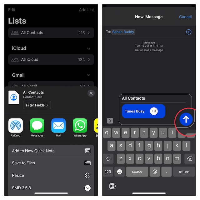 5.Τέλος, το τυποποιημένο φύλλο κοινής χρήσης θα σας επιτρέψει να εξάγετε τις επαφές του iPhone σας μέσω του προτιμώμενου μέσου όπως το WhatsApp, τα μηνύματα, το ταχυδρομείο και πολλά άλλα. Επιλέξτε την επιθυμητή εφαρμογή και μοιραστείτε τις επαφές.