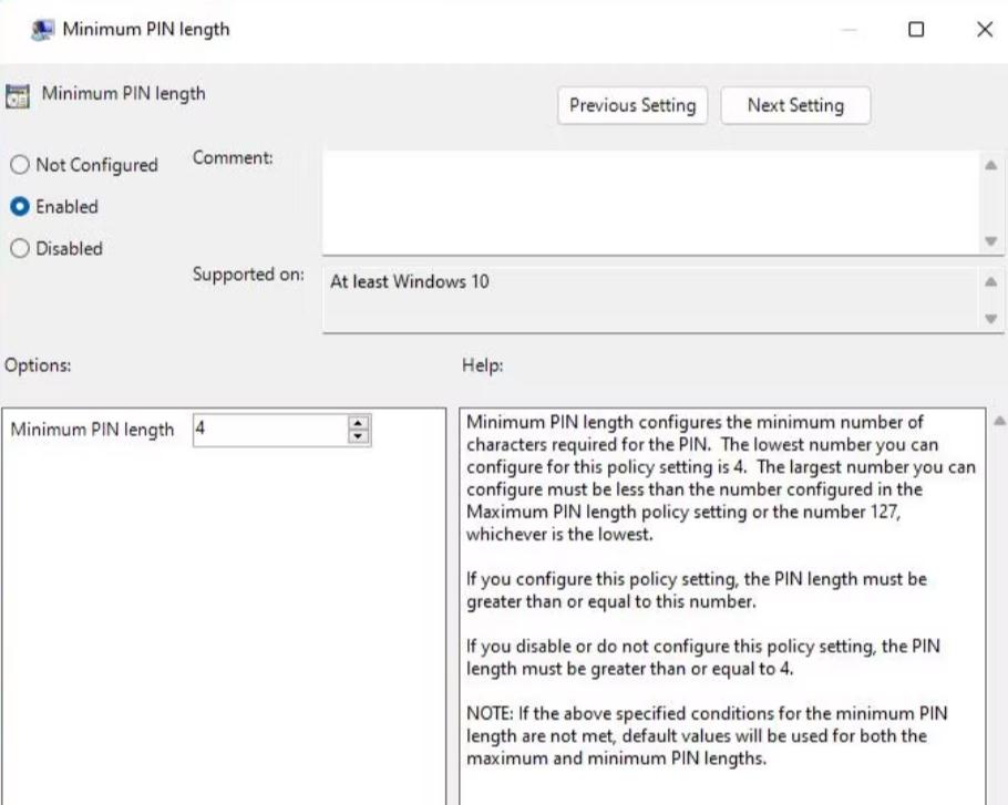 Βήμα 7:Τέλος, κάντε κλικ στο πλαίσιο κειμένου δίπλα στοΕλάχιστο μήκος PINκαι εισαγάγετε μια τιμή μεγαλύτερη από 4.